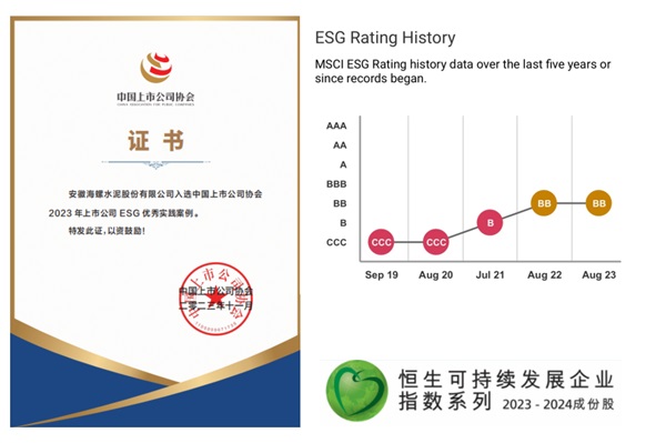 近年來,公司積極貫徹國家“雙碳”戰(zhàn)略,探索ESG創(chuàng)新發(fā)展,得到了國際國內(nèi)多方認可。國際知名評級機構MSCI對公司ESG評級提升至“BB”;今年9月海螺水泥被納入恒生可持續(xù)發(fā)展企業(yè)指數(shù)系列成分股;在近日中國上市公司協(xié)會發(fā)布的評選結果中,海螺水泥入選“2023年上市公司ESG優(yōu)秀實踐案例”。