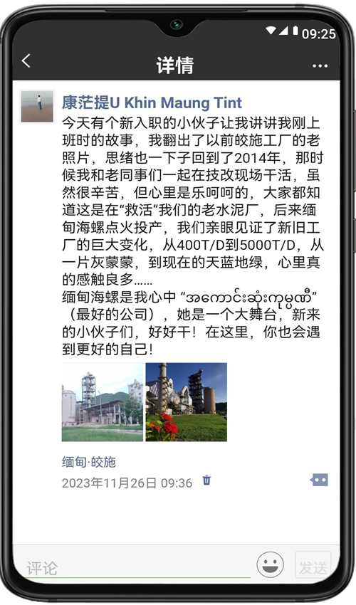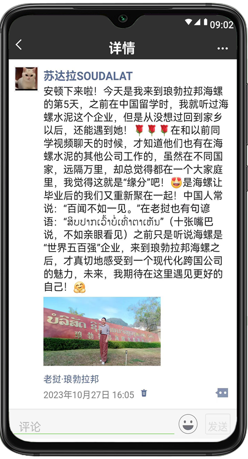 2023年是共建“一帶一路”倡議提出十周年,十年來,海螺水泥堅持人才“本地化”培養(yǎng),現(xiàn)在,海螺的大家庭里已有3000多名外籍員工,他們見證了一座座海螺工廠的拔地而起,還親身經(jīng)歷了海螺發(fā)展帶來的變化,在海螺收獲了成長和友誼。現(xiàn)在,就讓我們打開“朋友圈”,一起來看看他們的分享吧!
