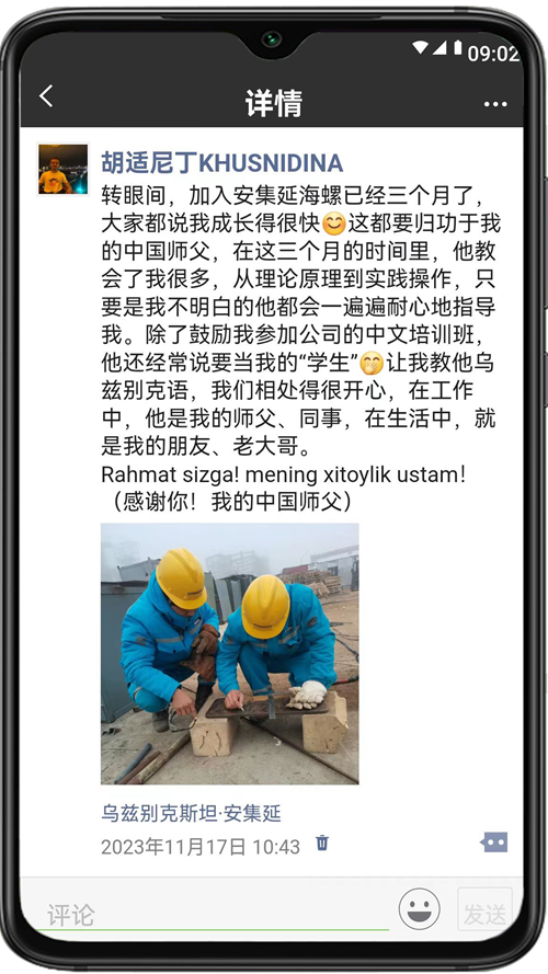 TUQMIRZAEV KHUSNIDINA(中文名:胡適尼?。?,2023年加入烏茲別克斯坦安集延海螺,現(xiàn)從事機械維修工作,照片為胡適尼丁和他的中國師父。