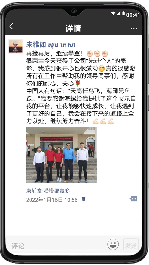 ??? ????(中文名:宋雅如),2017年進入柬埔寨馬德望海螺,曾獲海螺集團“2021年度先進工作者”榮譽稱號,現(xiàn)任馬德望海螺生產(chǎn)品質(zhì)處處長助理。