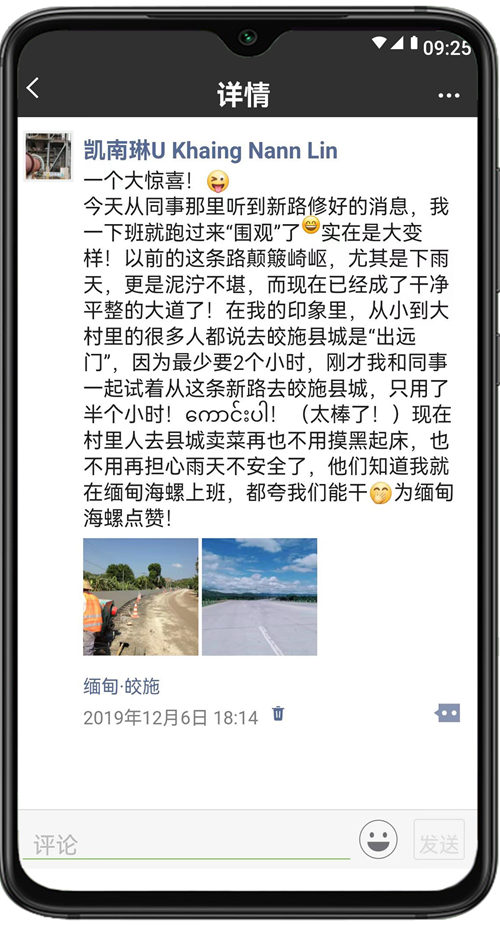 U Khaing Nann Lin(中文名:凱南琳),2017年進入緬甸海螺,他居住的PyaukSeikPin村位于公司附近,一直以來只有泥濘的土路通往村外,村民出行極為不便。2019年,緬甸海螺對該條道路進行鋪筑修繕,如今該道路已成為連接皎施縣城和PyaukSeikPin村的水泥大道,為村民的出行帶來了極大便利。