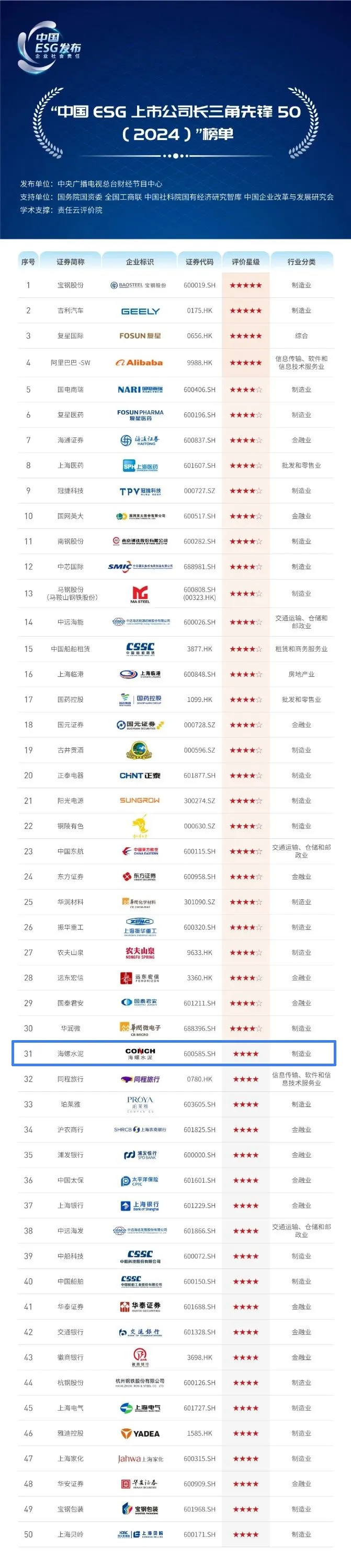 8月7日,中央廣播電視總臺《長三角ESG行動報告》正式對外發(fā)布。海螺水泥憑借優(yōu)異的ESG表現(xiàn),入選“中國ESG上市公司長三角先鋒50(2024)”榜單,名列第31位。