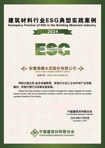 111314日,中國建筑材料聯(lián)合會(huì)在北京召開2024年度建筑材料行業(yè)大會(huì),會(huì)上發(fā)布了中國建筑材料行業(yè)ESG發(fā)展研究報(bào)告(2024)及典型案例,海螺水泥憑借在ESG方面的卓越實(shí)踐,成功入選“2024年度建筑材料行業(yè)ESG典型實(shí)踐案例。