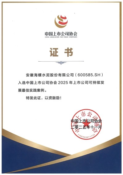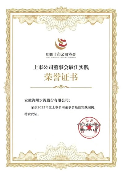 2025年11月18日,中國上市公司協(xié)會(huì)在北京召開了第三屆理事會(huì)第六次會(huì)議和2025上市公司可持續(xù)發(fā)展大會(huì),大會(huì)舉行了“2025董事會(huì)最佳實(shí)踐案例”“2025可持續(xù)發(fā)展最佳實(shí)踐案例”發(fā)布儀式,海螺水泥同時(shí)榮獲“2025董事會(huì)最佳實(shí)踐案例”和“2025上市公司可持續(xù)發(fā)展最佳實(shí)踐案例”。