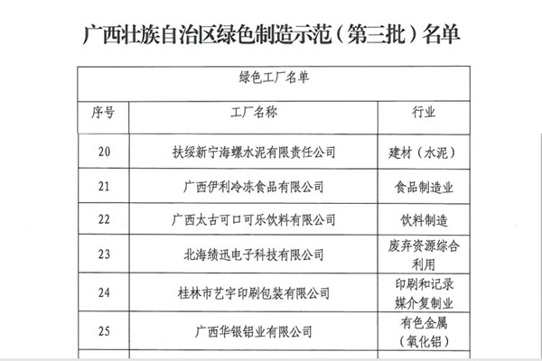 近日,廣西自治區(qū)工業(yè)信息化廳發(fā)布廣西第三批綠色工廠名單,扶綏新寧海螺水泥有限責任公司榜上有名,榮獲“自治區(qū)級綠色工廠”榮譽稱號。