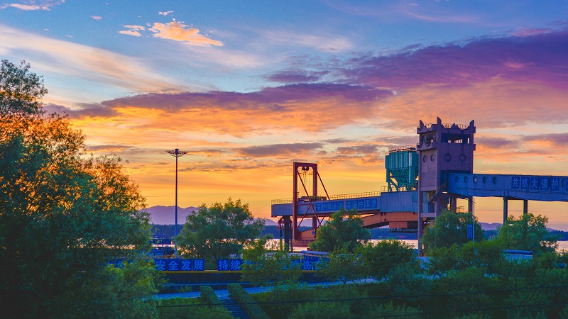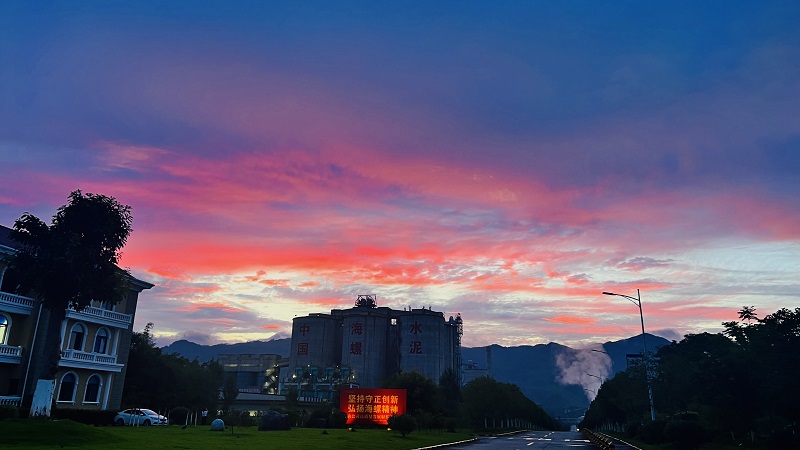 “綠樹青山帶晚霞,樹間處處有人家”是明代王直《題畫》中對于晚霞美景的描繪。綠樹、青山、晚霞,還有林間的人家,組成了一副閑適、恬靜的畫面。紅霞漫天、余暉鋪灑,此刻,自然與人文的和諧之美在海螺水泥的工廠中更顯意味。
