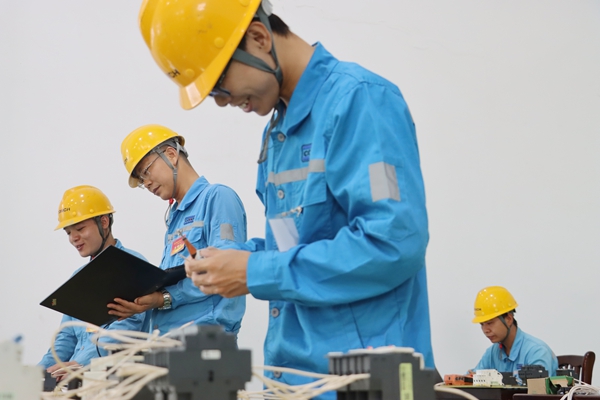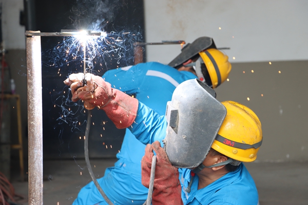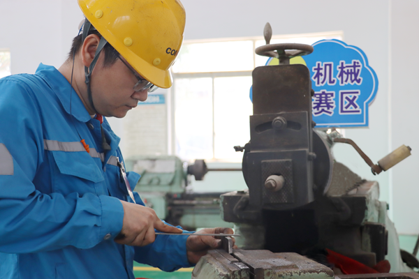 比武現(xiàn)場氣氛緊張熱烈,參賽選手全神貫注,各顯神通,紛紛“曬”出看家本領(lǐng)。在機(jī)械操作項(xiàng)目賽區(qū),焊工選手們嚴(yán)守安全操作規(guī)程,穿戴好勞動(dòng)防護(hù)用品,半蹲或半跪在地上,屏氣凝神,左手穩(wěn)穩(wěn)把住面罩,右手精準(zhǔn)操作焊槍,在焊條與金屬碰撞的瞬間,迸發(fā)出千萬點(diǎn)燦爛金花。另一邊,鉗工選手正站在操作臺(tái)前,身體微微前傾,細(xì)心打磨著自己的“得意之作”。品質(zhì)賽區(qū)的選手們也專注地投入在檢測操作當(dāng)中,從稱量到校準(zhǔn)全程精益求精,以近乎嚴(yán)苛的標(biāo)準(zhǔn)把控每個(gè)細(xì)節(jié),操作流程規(guī)范流暢,充分展現(xiàn)了質(zhì)檢人的專業(yè)素養(yǎng)。電氣賽區(qū)的選手們也不甘示弱,一個(gè)個(gè)化身為電流世界的“指揮官”,接線布置認(rèn)真細(xì)致,PLC編程操作行云流水,贏得聲聲贊嘆!