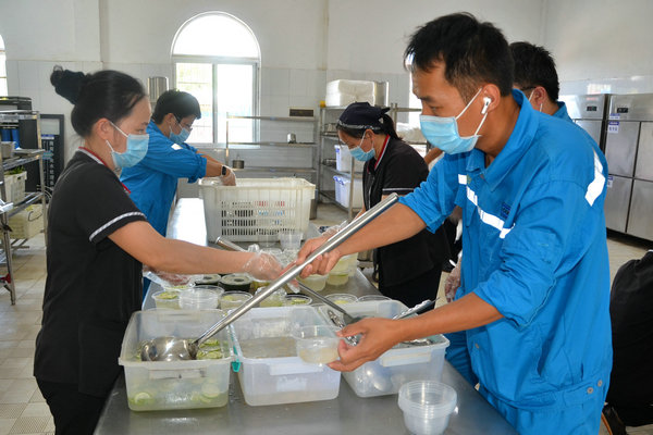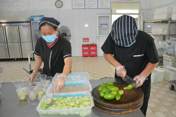 采摘下來的新鮮龍眼和檸檬很快被送往食堂,食堂師傅們忙碌起來,將飽滿多汁的龍眼剝殼取肉,檸檬切片榨汁,熬制當(dāng)?shù)靥禺a(chǎn)涼粉草。龍眼果肉與檸檬片在清冽礦泉水中舒展,釋放出清甜與微酸的完美協(xié)奏;涼粉草熬制的“北流涼粉”,凝凍如墨玉,清涼解暑。天然原料經(jīng)巧手化作兩大消暑佳品——晶瑩剔透的龍眼檸檬水與地道爽滑的“北流涼粉”。冰鎮(zhèn)后的飲品帶著果香與涼意,被后勤人員分裝成杯,及時送到各崗位。