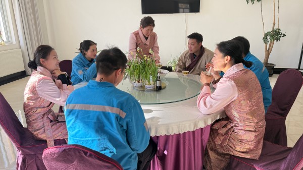 這份對(duì)“年”的認(rèn)真和期盼,很快勾起滿室共鳴。從牧區(qū)來的措姆,說起她家鄉(xiāng)的新年,臉上都是笑:“過年前,我阿媽會(huì)花好多心思準(zhǔn)備‘切瑪’(五谷斗),里面裝好糌粑、麥粒,插上青稞穗和酥油做的花,看著就歡喜,寓意豐收。除夕晚上吃‘古突’才熱鬧呢,面團(tuán)里藏著鹽巴、辣椒、羊毛,誰吃到什么,就預(yù)示他新一年的脾氣或運(yùn)氣,大家互相猜,笑話能笑一整晚!”她講得手舞足蹈,描述鮮活熱烈,草原的奔放歡騰順著話音帶到了同事面前。來自四川的漢族同事小劉也忍不住分享:“這時(shí)候,我家也該熏臘肉了,滿院子都是煙煙火火的香氣,還要寫春聯(lián)、守歲,桌上總有一大盤吃不完的菜,叫‘年年有余’!”