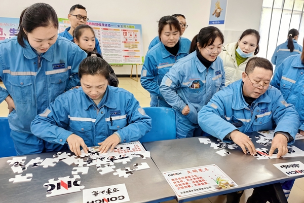 在本次迎新春活動(dòng)中,“拼出未來(lái)·新年‘拼’好運(yùn)”拼圖游戲以其獨(dú)特的設(shè)計(jì)和寓意深受喜愛(ài)。以海螺水泥標(biāo)識(shí)為核心視覺(jué)元素,巧妙融入春節(jié)傳統(tǒng)紋樣與吉祥符號(hào),既彰顯企業(yè)文化認(rèn)同,又傳遞出濃濃的年節(jié)氛圍。參與者凝神聚力、專(zhuān)注拼合每一塊圖塊,爭(zhēng)分奪秒呈現(xiàn)完整畫(huà)面。這一過(guò)程不僅考驗(yàn)參與者的觀察力與耐心,更通過(guò)視覺(jué)化的方式,深化了職工對(duì)企業(yè)品牌的感知與認(rèn)同,也寓意著每一位職工都是企業(yè)宏圖的一塊重要拼圖,共同拼出新年新氣象。